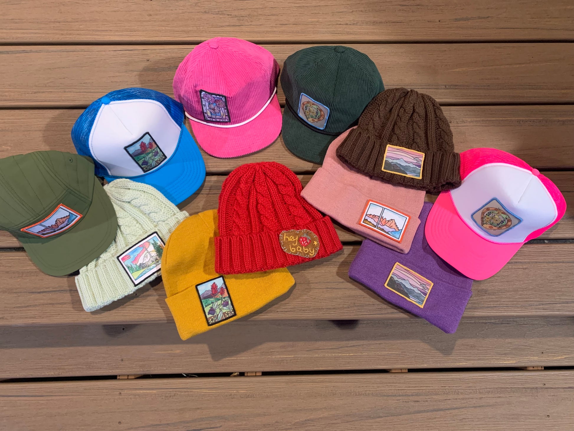 My original artwork is printed on these sweet canvas patches. Each one is hand sewn by me in a unique location.